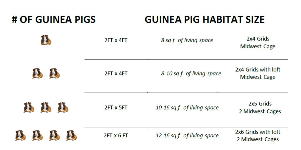 For one or a pair of guinea pigs a minimum 2ft x 4ft enclosure like the “MidWest Guinea Pig Habitat” is recommended, if possible a larger 2ft x 5ft enclosure is preferred. Cages and hutches do not provide enough room for adequate exercise and overall well-being.